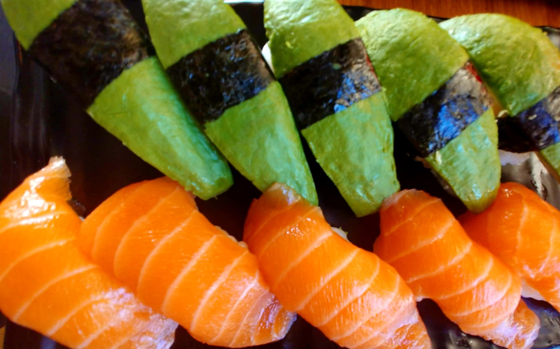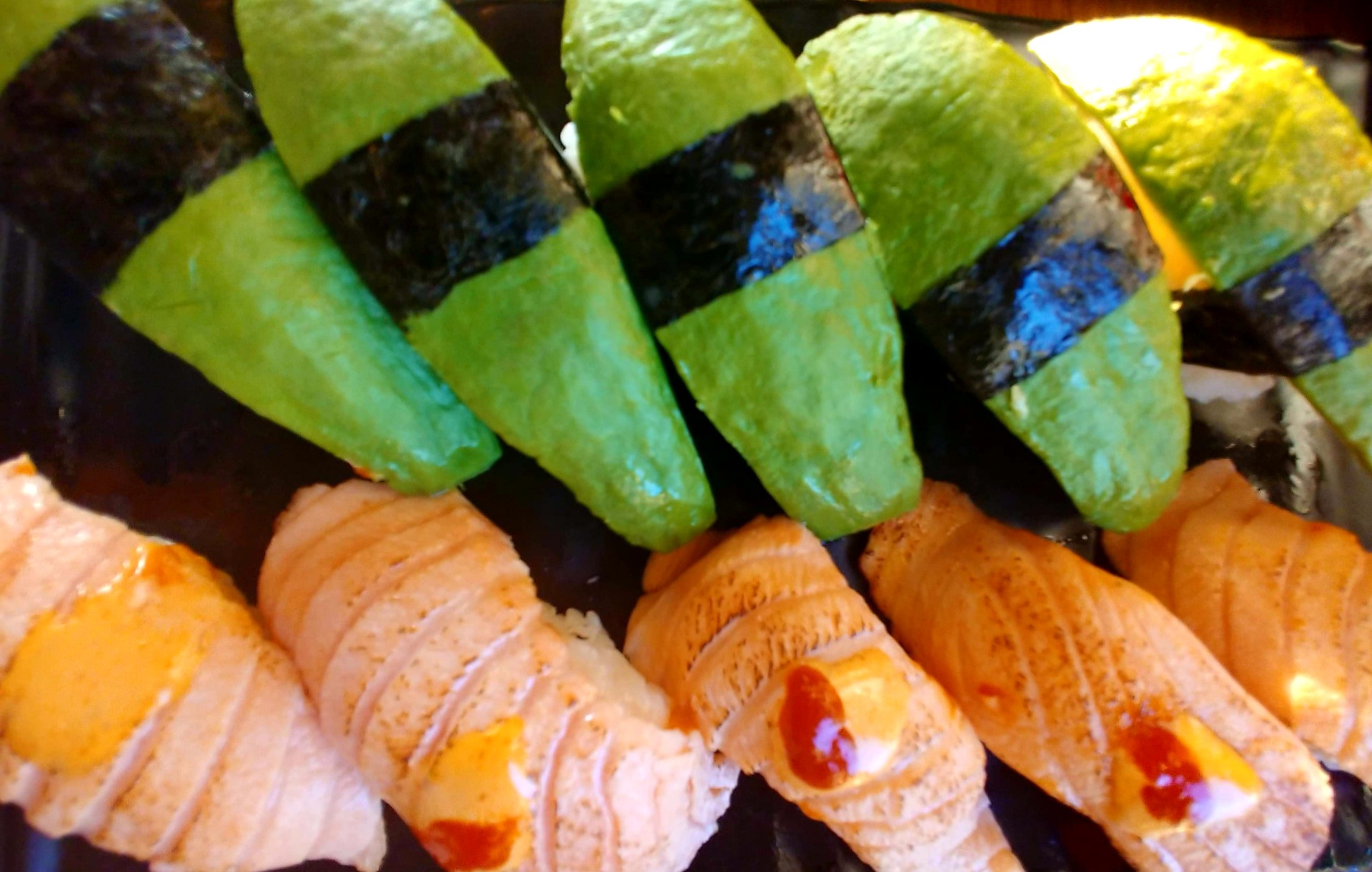 5 avokado nigiri och grillad lax nigiri