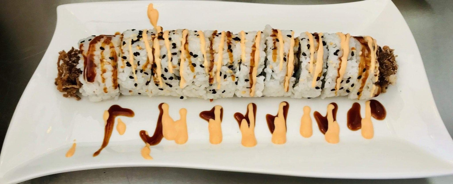 Gurka, avokado, crabstick, toppad med grillad lax, teriyakisås, chilimajonäs, och chilisås